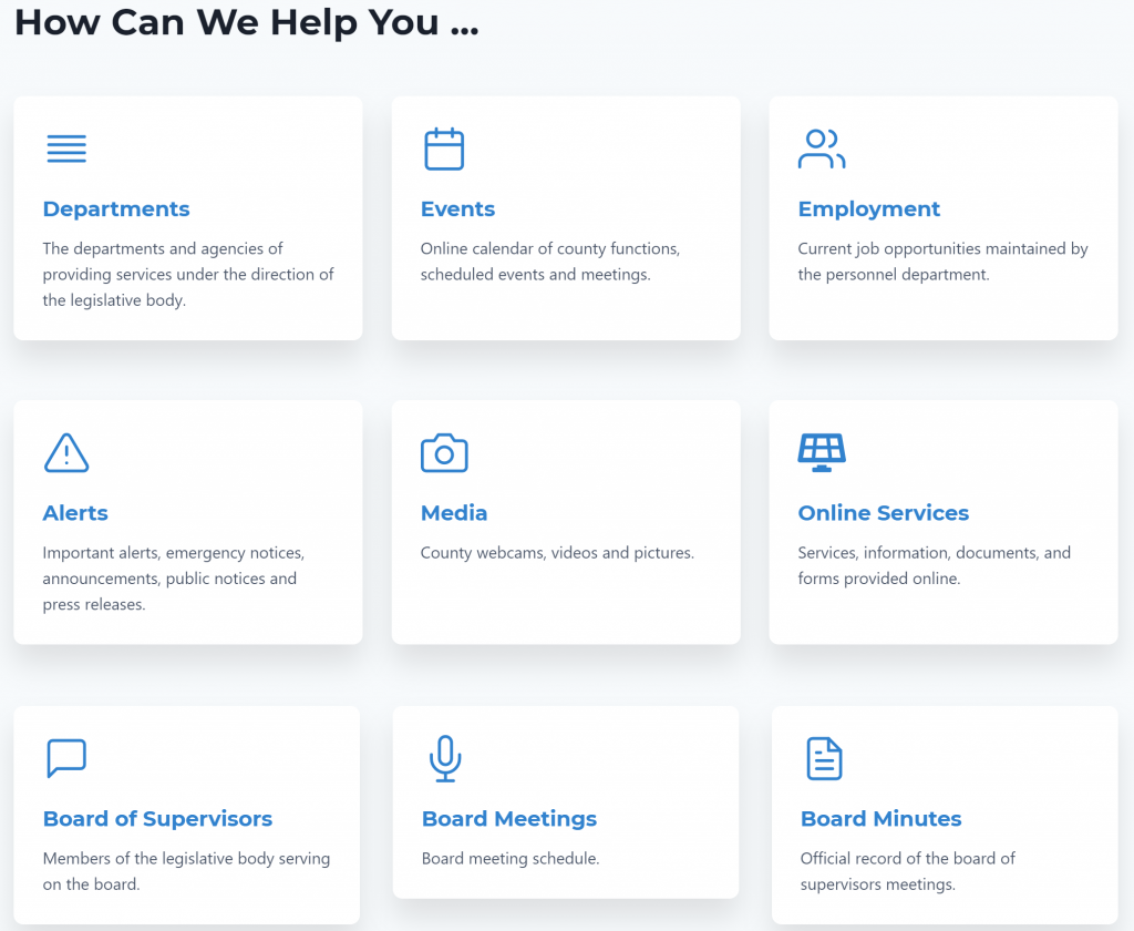 Keep up to date with board meeting schedules, online meeting zoom links, call in meeting information and more. Scroll down on the County’s website home page to find other helpful links: