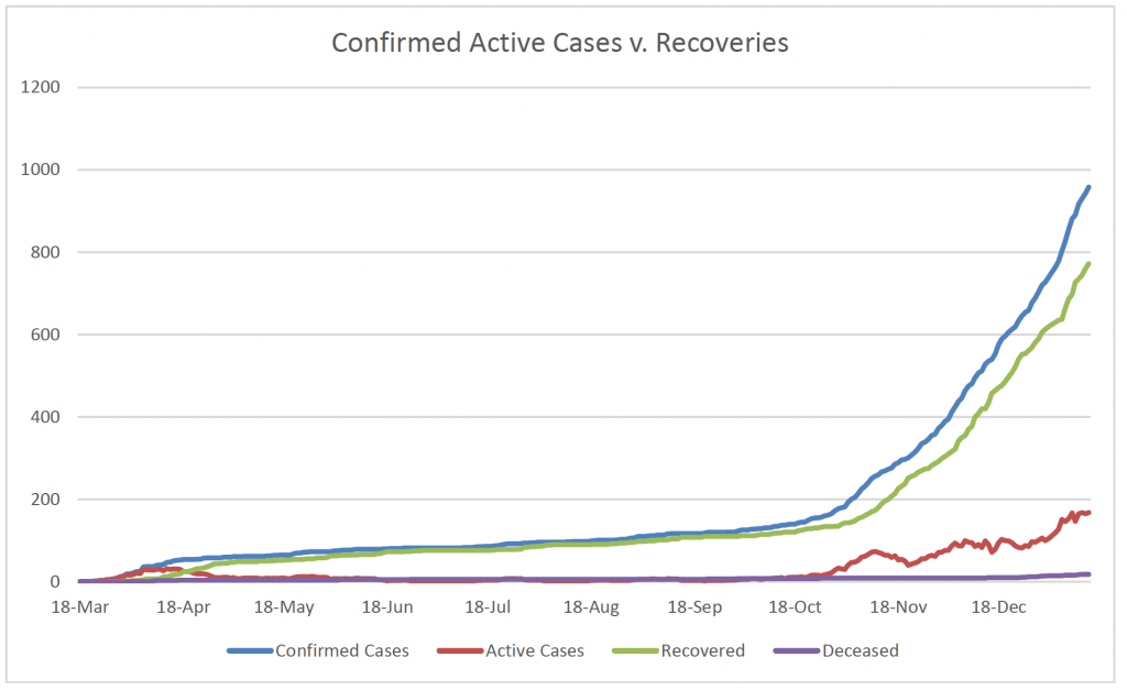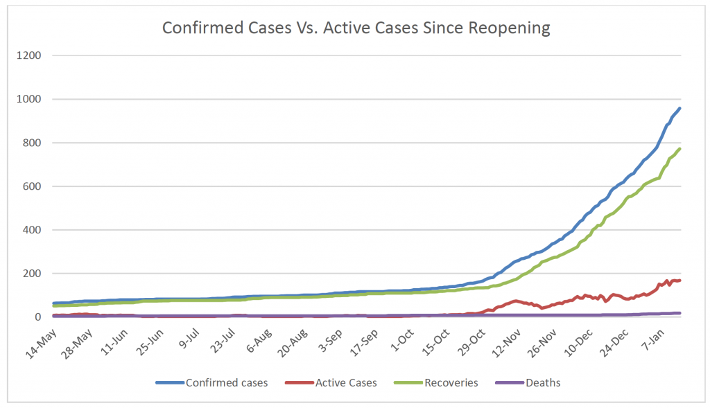 The following chart represents the last 14 days of positive reports, active cases, and recovered cases.