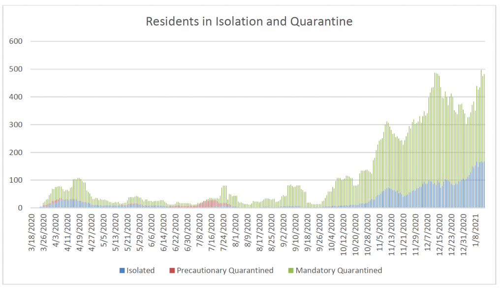 The following chart shows the number of residents quarantined versus those isolated as positive COVID cases.