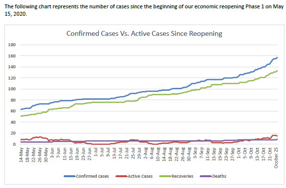 Sadly, Delaware County has been notified of one death today. We send our deepest condolences to the family and friends impacted. The recent uptick in cases continues in the Southern Tier region so please continue to practice social distancing, wear face coverings when out in public, and wash your hands regularly. As the weather turns colder and we are spending more time these practices are even more important. The numbers in Delaware County are generally stable as we continue to report several recoveries along with new cases. Delaware County Public Health posts a daily dashboard to show how many new cases and recoveries are reported each day. You can find the dashboard posted to the Delaware County webpage at: http://www.co.delaware.ny.us.