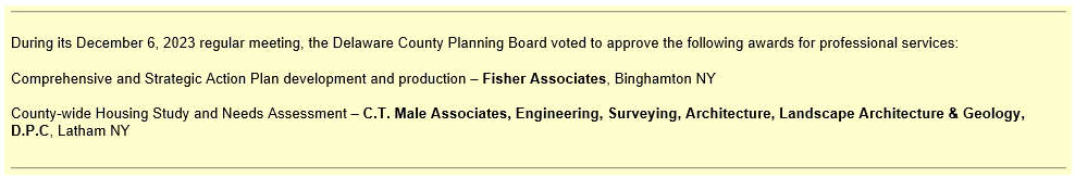 The County Planning Board meets the first Wednesday of every month at 7:00 pm at the Delaware County Office Building,111 Main Street, Delhi, NY 13753.